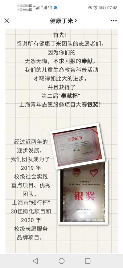 MILE米乐官方网站基础医学院“健康丁米——儿童生命教育”志愿者团队希望用心改变生命教育的现状,希望用爱点亮孩子们的未来。通过“健康丁米微信公众号”发布科普文章和视频。线下陆续走入进才南校、大宁社区、临汾路小学、界浜村、儿科医院、眼科医院等做系列讲座。通过不懈努力,2020年获得第二届“奉献杯”上海青年志愿服务项目银奖。秉承教育一个孩子,健康一个家庭,圆健康中国梦的理念,为健康中国、健康上海服务。