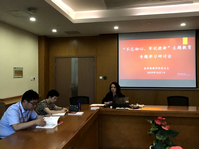 10月1日下午,医学影像学院党总支举行“不忘初心、牢记使命”主题教育专题学习研讨会,学院班子成员、党总支委员参加学习研讨。刘红书记首先对9月进行的主题教育进行阶段小结,并结合市教卫工作党委和学校党委的工作部署,对下一阶段主题教育工作提出要求。她表示必须高度重视主题教育工作,不折不扣的按照上级要求完成,必须准确把握主题教育的目标任务和总体要求,把主题教育作为重大政治任务来抓。她担任主讲,解读了习近平总书记关于反对形式主义、官僚主义的重要讲话重点内容。在研讨交流环节,院长徐小萍、副院长姚旭峰分别结合本学院工作进行发言交流。他们表示修订学院人才培养方案,一定要联系实际,多征求各方意见,切忌拍脑袋的官僚主义。在教学、科研上要想人之所想,急人之所急,在发挥带头作用的同时,关心身边的老师们,提高学院的凝聚力。