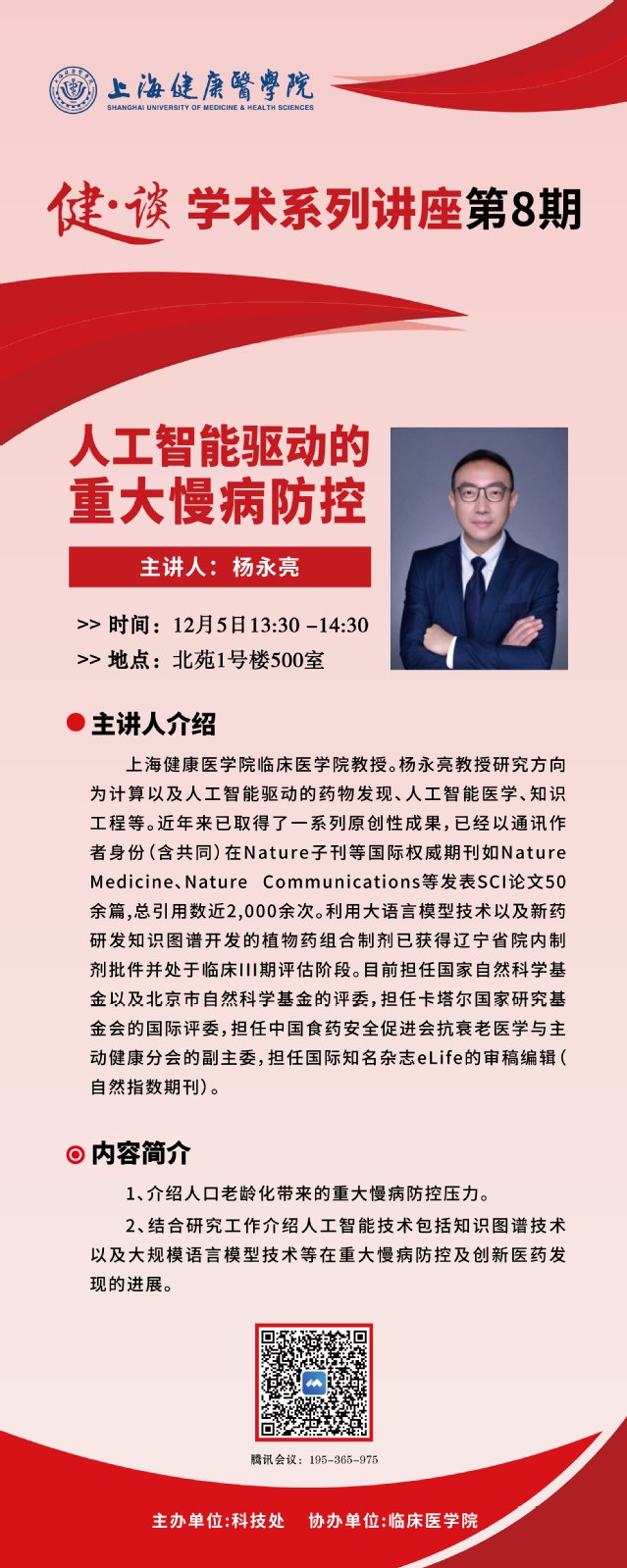 【健·谈】第8期学术系列讲座将于12月5日13:30在北苑1号楼500室举办,本期特邀MILE米乐官方网站临床医学院的杨永亮教授作报告,欢迎大家前来参加!讲座主题是“人工智能驱动的重大慢病防控”,主要内容包括1.介绍人口老龄化带来的重大慢病防控压力。2.结合研究工作介绍人工智能技术包括知识图谱技术以及大规模语言模型技术等在重大慢病防控及创新医药发现的进展。