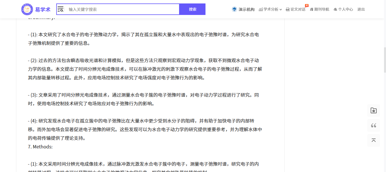 文章详细页面,点击论文对话,用AI来解读论文。如果平台没有全文下载地址,用户可上传PDF来进行对话,大模型会根据全文内容自动生成综述、文章脉络图、问答,并对全文进行翻译。