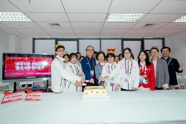 主题党日活动后,一场别具温情的集体生日会为进博场馆增添了融融暖意。唐红梅代表学校亲切慰问了5位在11月间过生日的健康“小叶子”,并与他们一同切分生日蛋糕,将关怀与温暖送至同学心中。寿星“小叶子”们激动地表示,这个在“四叶草”里度过的生日,已成为他们进博之旅中最温暖难忘的记忆,深刻体会到身在集体的归属与幸福。他们一致表示,这不仅是对他们的关怀,更是一份激励与期许。他们将把这份感动转化为服务进博的更强动力,用实际行动践行青春誓言,向世界展现中国青年刚健有为的时代风采,这正是“人民健康”理念在进博一线的生动实践。