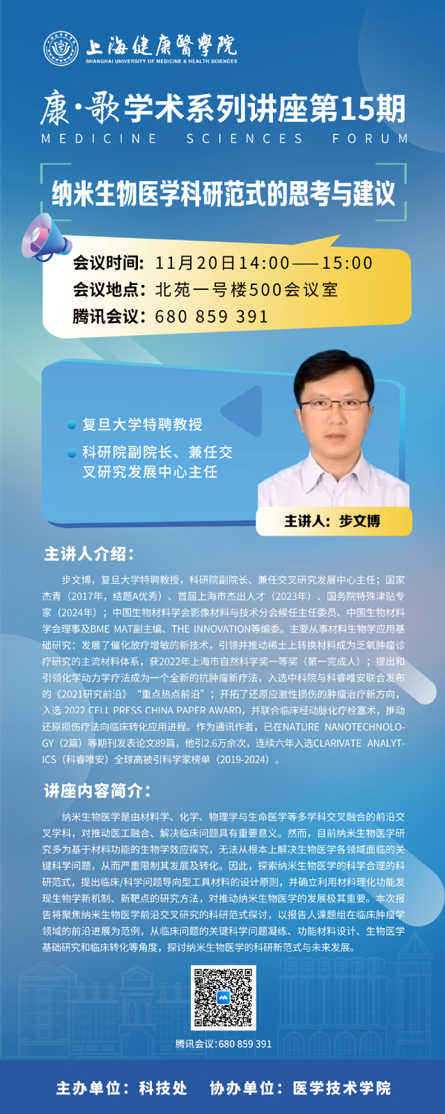 【康·歌】第15期学术系列讲座将于2025年11月20日14:00在北苑1号楼500室举办,本期特邀复旦大学特聘教授,科研院副院长步文博教授。作主题为“纳米生物医学科研范式的思考和建议”的报告。