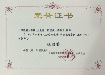 自大赛启动以来,图文信息中心高度重视,系统开展赛前培训、模拟演练和专题辅导。参赛团队通过AI工具实现信息的高效筛选、深度分析与创新呈现,既展现了扎实的专业功底,又凸显了“AI+医学”的创新应用潜力,最终提交的开放主题作品构思新颖、切合实际,获得了评审专家的高度认可:“赛博荷鲁斯队”(顾静、袁佩岑、吕欣宸)凭借精准的AI工具应用与严谨的问题解决方案,荣获一等奖;“信创未来队”(金嘉仪、唐佳奇、张静瑜)聚焦健康信息科普场景,荣获三等奖;“健康喵喵队”(金展亦、陆俊奕、胡嘉予)、“学医到底对不队”(丁明锦、邹杨、陈虹霓)、“量子智脑队”(魏鸣畅、陶姿亦、王译慜)三支队伍凭借扎实的基础能力与创新探索,荣获优胜奖。