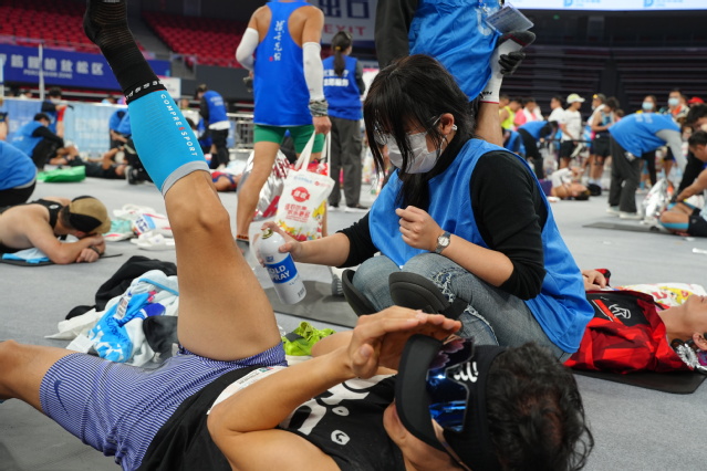 随着跑者陆续抵达终点,志愿者们迅速进入状态。他们运用在校所学的康复知识与手法,耐心地为疲惫的跑者进行腿部肌肉的松解与拉伸,每一个动作都严谨而温柔。现场,随处可见志愿者们单膝跪地,全神贯注地工作,而跑者们从最初因肌肉酸痛而紧锁眉头,到最终舒展身体、露出轻松微笑的画面,则是对志愿者们辛勤付出的最高赞誉。