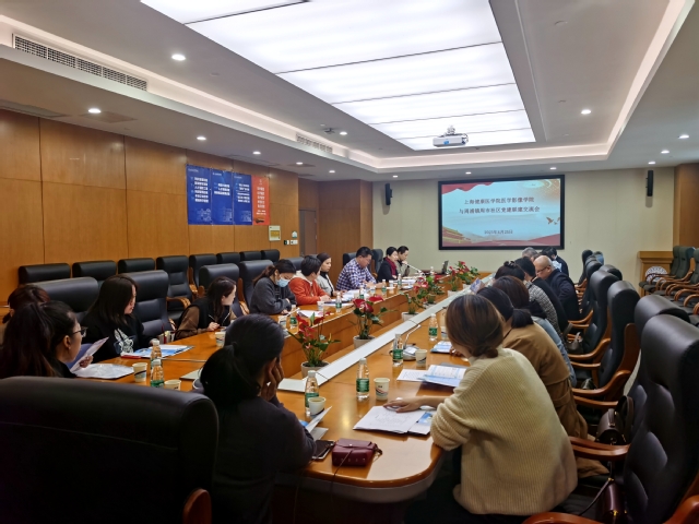 为全面贯彻落实新时代党的组织路线,推动基层党建工作高质量开展,深入开展学习贯彻习近平新时代中国特色社会主义思想主题教育,实现基层党组织共联、行动共进、成果共享,4月25日下午,周浦镇周市社区党委书记钱国文一行18人来访医学影像学院,开展党建工作交流,学院党总支书记朱清、党总支副书记乔慧敏、专职组织员谭松珊、学生党支部书记孙佳鸣参加交流会。