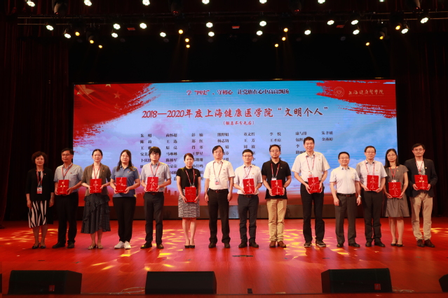 第二篇章,危难时刻显本色,战疫有我见初心。屏幕上展现了由党委宣传部制作的《致敬》微视频,生动展现了在人民生命安全受到极大危机时,米乐师生、附属医院医护人员、校友,用不同方式履行白衣天使的职责,捍卫人民生命和健康,他们就是我们身边的英雄。由米乐组织部、学工部、教务处、二级学院、附属医院、附属卫校、后勤服务中心、保卫处等讲述的真实故事《一切为了育人》。疫情就是命令,防控就是责任,他们在关键时刻选择逆行而上,毅然决然地践行党员初心,以实际行动为抗击疫情出一份力,奉献于抗击疫情一线,服务于防止疫情传播的社区,坚守于本职岗位教与学,我们都是“应考人”和“答卷人”。接着,副校长陈小冰、唐红梅、孔宪明为荣获2018-2020年度学校“文明个人”代表颁奖。