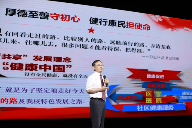 主题活动在全场奏唱国歌中拉开帷幕。郑锦书记说,2020年是爱国主义教育年、三全育人攻坚年和建党百年献礼年,站在这个重大时间节点上,我们既要回顾历史,增强光荣感和自信心,更要立足当下,推进新的事业和伟大征程。我们要努力做到“三个着力”,一是着力做好“四史”学习教育,坚定我们的理想信念、牢记初心使命;二是着力用好抗击疫情的生动素材,增强我们救死扶伤、医者仁心的责任担当;三是着力加强精神文明建设,宣传学校本科建校5年暨办学70周年的建设成就,弘扬埋头苦干、砥砺前行的奋斗激情。