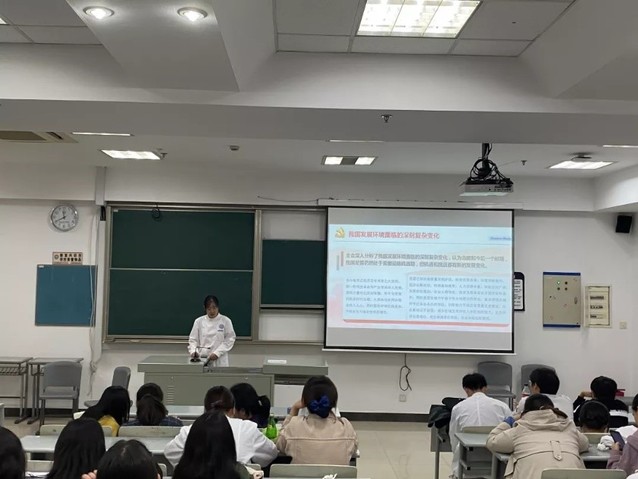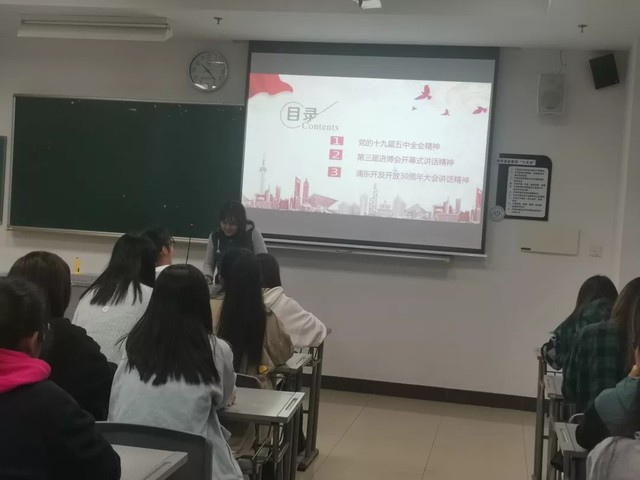 之后由团支书季文婷带领同学们一起通过学习习总书记讲话、浦东开发开放30年来的图片对比以及经济方面的增长、变化多方位为大家展示浦东开发开放30年来的显著成果。最后以告诉大家中国近几年来发展成果显著,而未来的发展还要靠大家的一齐努力为活动结尾。