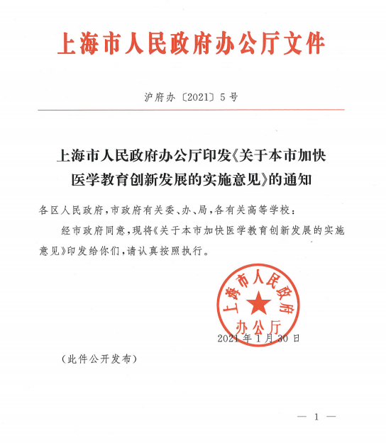 2020年9月17日国务院办公厅印发了《关于加快医学教育创新发展的指导意见》(国办发〔2020〕34号),把医学教育摆在关系教育和卫生健康事业优先发展的重要地位,对今后医学教育具有方向性的引领作用。上海市积极贯彻文件精神,结合上海“五个中心”建设和具有世界影响力的社会主义现代化国际大都市建设的发展定位,提出了本市加快医学教育创新发展的实施意见,这对建成具有中国特色、上海特点的更高水平医学人才培养体系具有重要指导意义。(临床医学院)