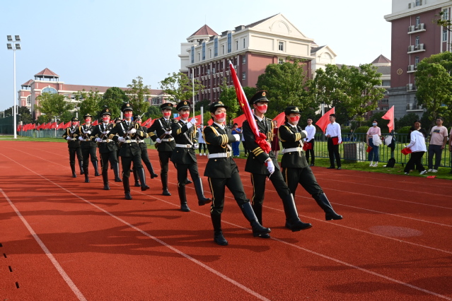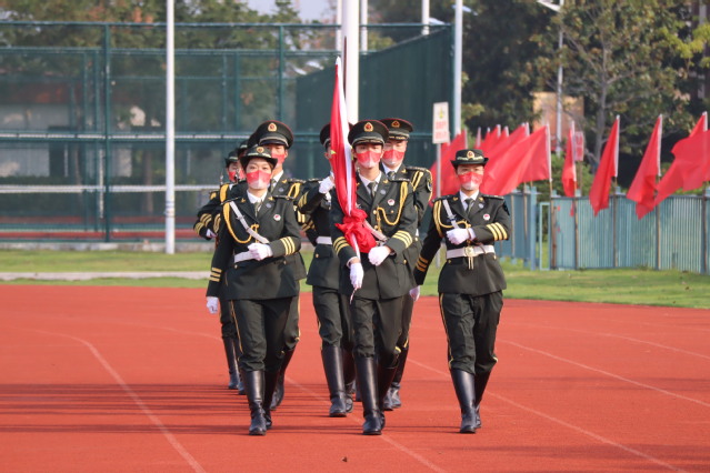上午8时,国旗护卫队迈着整齐划一、铿锵有力的步伐,护送国旗至升旗台前。在场师生庄严肃立,面向五星红旗高唱国歌,心中激情澎湃,在雄壮的义勇军进行曲中,注视着五星红旗冉冉升起,嘹亮的歌声响彻云霄。