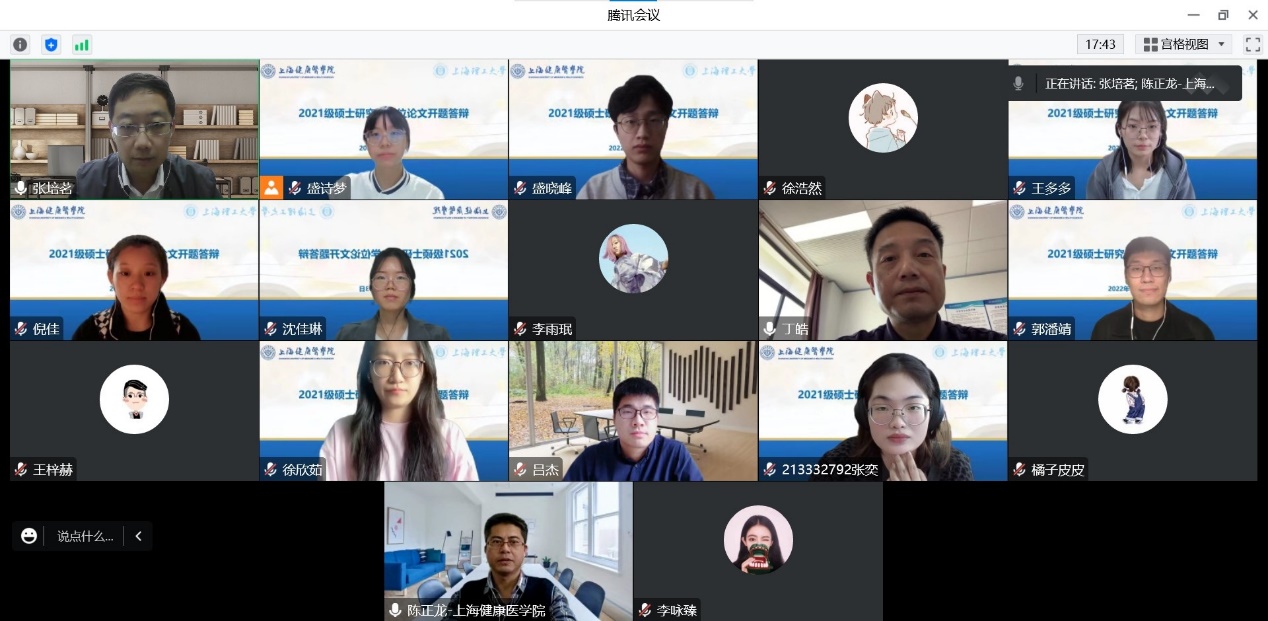 10月13日,医疗器械学院举办2021级上海理工大学联合培养硕士研究生开题答辩会。开题作为研究生培养的关键环节,对研究生日后的学习、科研训练与学位论文撰写起着至关重要的作用。本次报告会采用线上模式,共分为3组,邀请上海市精神卫生中心苏杭副研究员、上海市医疗器械检验研究院王伟高级工程师、上海对外经贸大学戴永辉副教授和12位研究生导师共同担任评委,其他年级硕士研究生观摩学习。