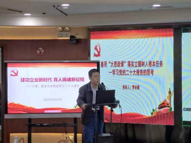 10月27日下午,文理、图文支部联组学习党的二十大报告,马克思主义学院教师罗会德教授受邀作题为“善用‘大思政课’,落实立德树人根本任务”的专题报告。