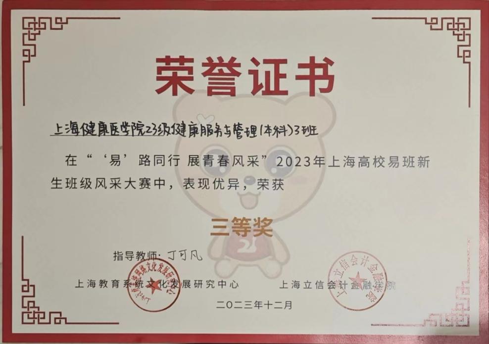 12月10日,护理与健康管理学院23级健康服务与管理(本科)3班在班级辅导员丁可凡老师的带领下,前往上海立信会计金融学院参加“‘易’路同行、展青春风采”上海高校易班新生班级风采大赛决赛。23级健康服务与管理(本科)3班此前积极组织班级同学准备材料上传易班参加初赛,经过复赛网络投票获得复赛资格,最终在决赛中获得三等奖的好成绩。