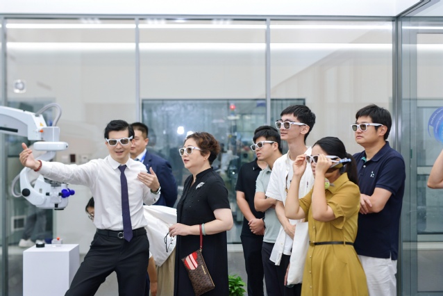 在蔡司相关负责人的陪同下,姚谷芳一行首先参观了蔡司大中华区总部展示中心,系统了解了蔡司逾百年的发展历程、企业文化和科技创新成果。随后,在蔡司各部门负责人的引导下,深入了解了蔡司在眼科医疗技术、光学消费品市场、半导体制造技术、工业质量与研究以及显微镜系统等五大业务板块的前沿产品与技术应用,对蔡司在医疗、光学与光电领域的全球领先地位有了更加直观和深入的认识。