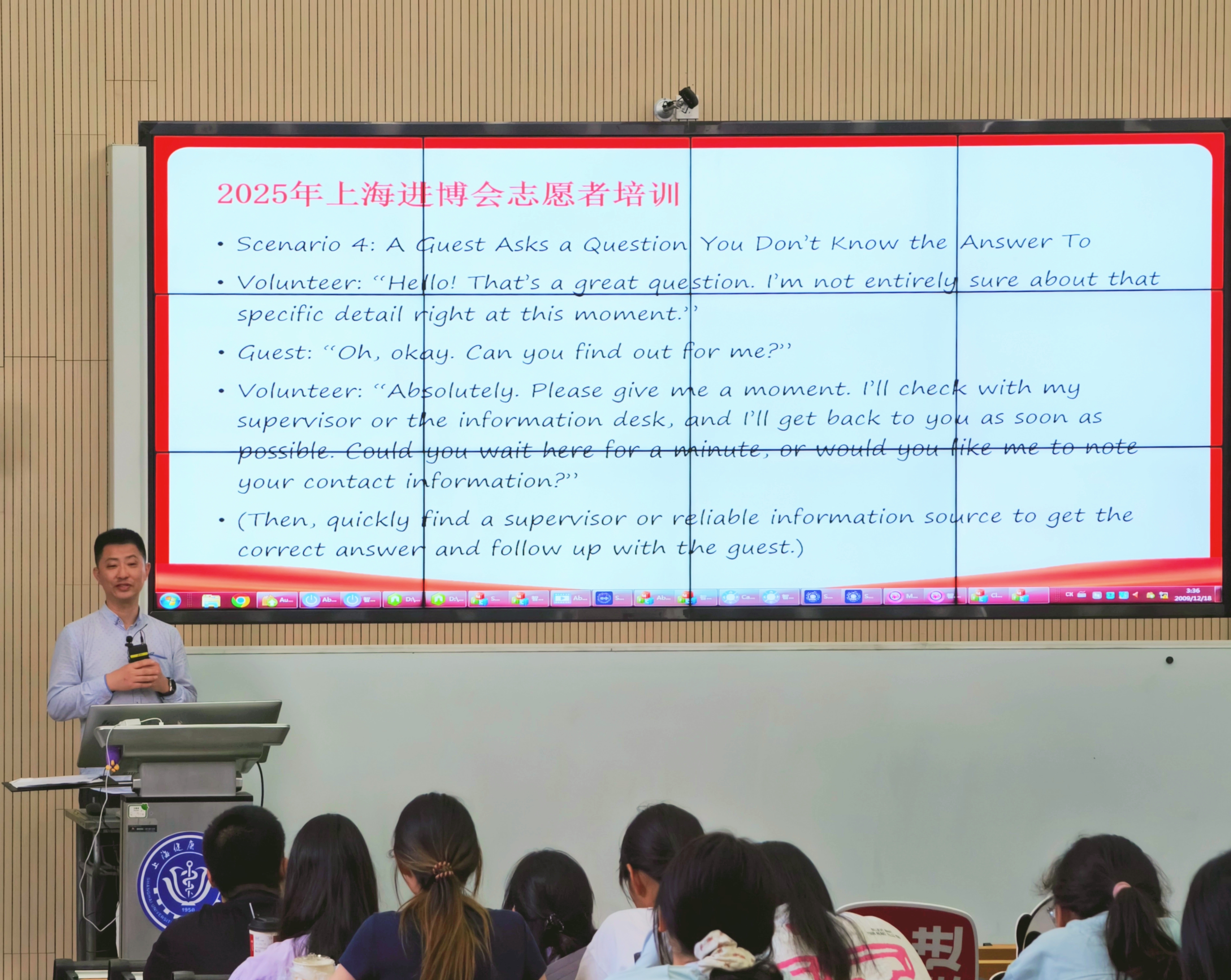 阮俊斌老师结合自身丰富的教学经验和跨文化沟通知识,不仅系统讲解了各项服务要求,更将重点放在了语言的实际应用上。他精心选取了进博会现场可能遇到的典型场景,如游客物品遗失时的安抚与协助、游客感到不适时的紧急应对、为游客指路时的清晰指引等,并详细演示了在这些情境下如何运用恰当、专业的语言进行沟通。阮老师生动的讲解和案例分析,使志愿者们深刻认识到语言在跨文化服务中的桥梁作用,也让他们掌握了在不同情境下有效沟通的技巧。