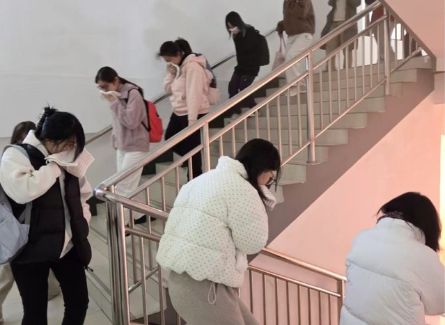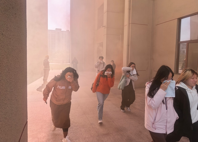 中午11点50分,警报拉响,消防逃生演练正式开始。南苑W楼内模拟浓烟迅速弥漫至各楼层走廊,逼真还原了火灾现场的紧张氛围。教室内的师生闻声而动,在现场工作人员的引导下,迅速用毛巾捂住口鼻,保持弯腰低姿安全姿势,按指定疏散路线快速、有序地向楼外撤离。仅用时两分钟,近百名师生安全转移至教学楼北广场的指定集合区域,实现了“零拥挤、零疏漏”的疏散目标。