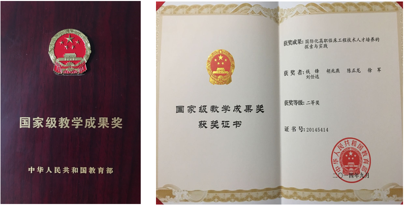 多年来临床工程技术人才培养的实践,得到了学校领导和业内同行专家的肯定,更得到了上级教育主管部门包括国家教育部和上海市教委的肯定,由专业主任钱锋负责申报的“国际化临床工程技术职业人才培养的探索与实践”首先于2013年获得了上海市教学成果一等奖,并由上海市教委推荐,报送国家教育部申报国家级教学成果奖。经过严格公正的评审,最终“国际化高职临床工程技术人才培养的探索与实践”于2014年又获得教育部国家级教学成果奖二等奖。中日合作临床工程技术教学团队也分别于2011年获得“教育先锋号”和2013年获得“上海市级教学团队”的荣誉称号。