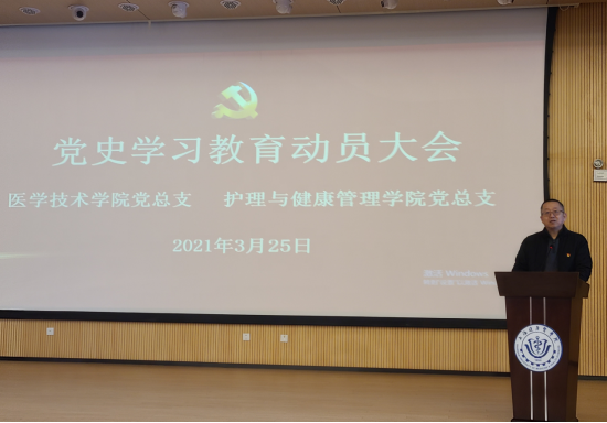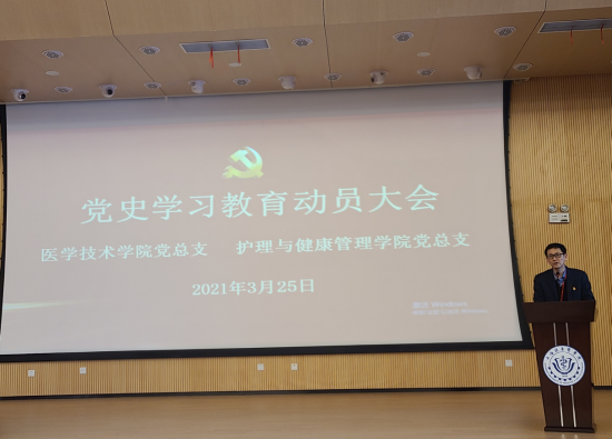 3月25日下午,护管与医技学院党总支在新南苑4号楼一楼300人报告厅联合举办二级学院党史学习教育动员会暨党史学习教育专题报告会,传达了校党委党史学习教育的部署、要求并开展了一场党史专题学习。两个学院的全体教职员工、学生党员和入党积极分子代表参加学习。会议由护管学院党总支副书记、院长朱爱勇主持。
