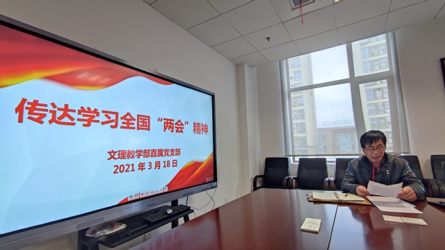 3月18日下午,文理教学部组织全体教师于南苑2号楼302会议室召开学习贯彻2021年“全国”两会精神专题会议,教学部党支部书记秦禹权主持了学习会。