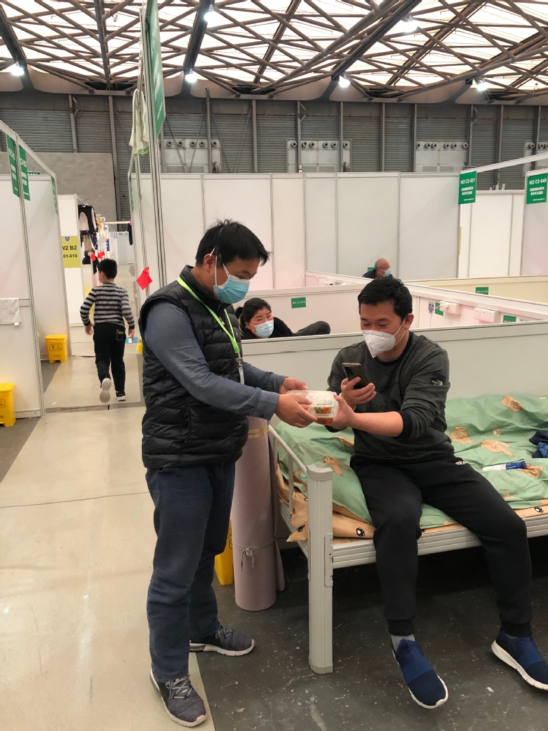 薛峰老师是学校财务处的一名普通职工,在这次新冠疫情中女儿检测出阳性,女儿年仅13岁,薛老师义无反顾选择于4月13日陪伴女儿进入新国际博览中心W2方舱。进入方舱后,薛峰老师一边照顾女儿,一边积极投身志愿者服务。每日的清晨5点,大家都在睡梦中时,志愿者们已经开始搬运早饭,有序组织分发,午饭、晚饭亦是如此,作为一个核酸阴性的人员,薛峰老师在这阳性的环境中也毅然走到每一位舱友的床前,为他们送上饭菜,没有退缩。每当护士站的物资到来,薛峰老师等几个男性志愿者冲锋在前,帮助搬运摆放,让医护人员安心做他们的本职工作。当新病友来到,薛峰老师和其他志愿者帮助分发被褥床套,指引他们到达分配的床位,介绍方舱的情况。当做核酸时,他又井然有序维护现场秩序,通知指定仓位的人员进行核酸。