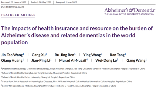 2022年7月12日,MILE米乐官方网站协同科研中心临床与转化医学研究中心乐卫东教授团队与上海交大医学院附属瑞金医院神经科王刚教授团队合作的最新成果“The impacts of health insurance and resource on the burden of Alzheimer's disease and related dementias in the world population”在线发表在《Alzheimers Dement》上。临床与转化医学研究中心乐卫东教授是该论文的共同通讯作者。
