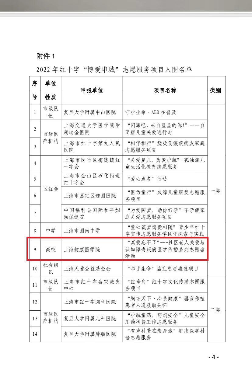 2022年8月,在校红十字会的大力支持下,护管学院徐婷老师具体负责的“真爱忘不了——社区老人关爱与认知障碍疾病医学传播”项目,经过上海市红十字会与上海市精神文明办、上海市志愿者协会,对多个申报项目的联合严格评选,成功立项并再次入围2022年上海市红十字“博爱申城”志愿服务活动项目一类项目。这是“真爱忘不了”志愿服务队第二次获得上海市红十字“博爱申城”项目品牌的认可与支持!