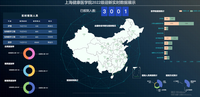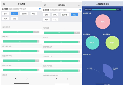 迎新当天,在学校服务微信“i健康”中,迎新系统还能为每一位老师提供学院、专业、不同学历类型的新生的报到实时统计数据查询的服务。哪个学院报到率最高?哪个专业报到率最高?哪个校区报到率最高?一目了然。为工作人员在报到当天能让新生有效完成学院报到程序以及各项后续工作开展等提供基础数据和决策的支撑。