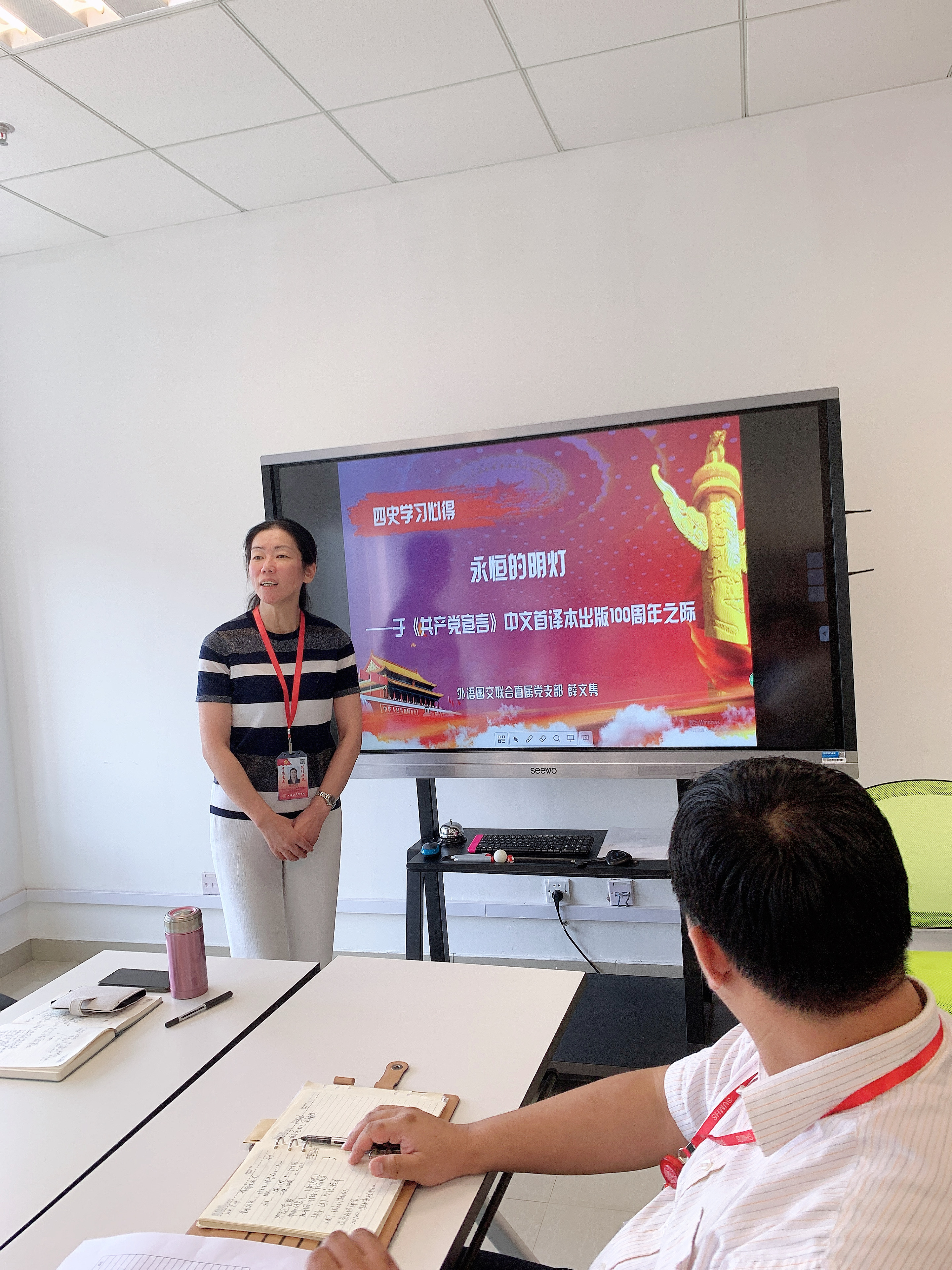 为纪念由陈望道先生翻译的首个中文全译本《共产党宣言》在上海出版100周年,让党员教师重温历史了解更多《共产党宣言》翻译史背后鲜为人知的故事,外语教学部主任薛文隽结合自身“四史”学习心得在南苑2号楼401为外语国交联合直属党支部全体党员做了“永恒的明灯”的专题党课,党课由支部书记吕永红同志主持,全体党员和预备党员教师参加。