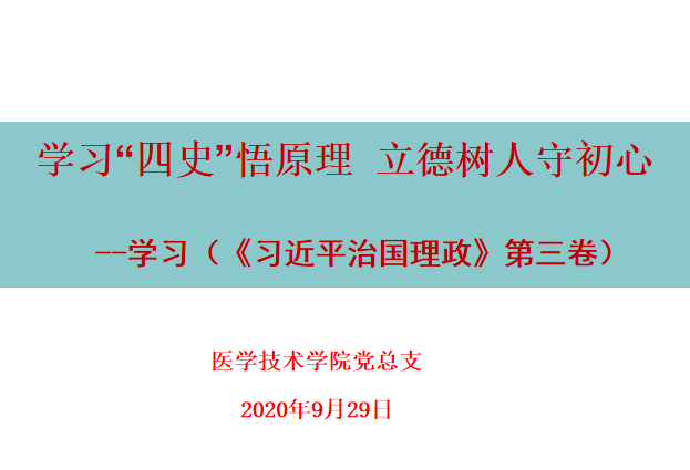 为深入学习习近平《习近平谈治国理政》第三卷,结合“四史”学习教育,医学技术学院全体中心组成员于9月29日12:00在4号楼507开展题为“学习‘四史’悟原理立德树人守初心”学习。