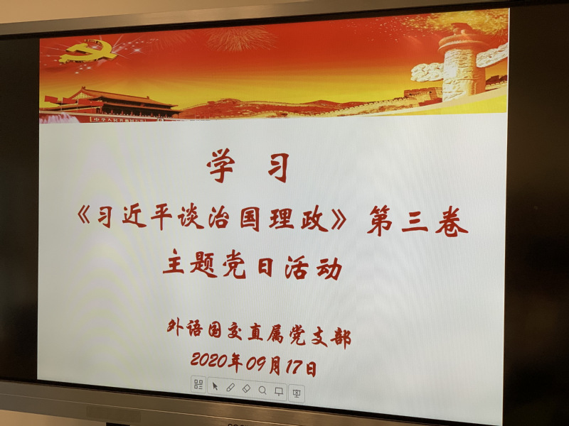 为贯彻落实中央宣传部、中央组织部关于认真学习《习近平谈治国理政》第三卷,用习近平新时代中国特色社会主义思想武装全党、教育人民的重大政治任务的通知,根据MILE米乐官方网站党委“四史”学习教育领导小组工作要求,2020年9月17日下午,在外语国交联合直属党支部书记吕永红同志的主持下,外语国交全体党员教师在南苑2号楼401室开展了“读原著、学原文、悟原理—学习《习近平谈治国理政》第三卷”主题党日活动。